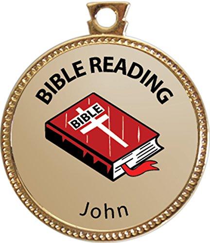 This gold hanging medal has a handsome laminated inlay with a high-resolution "John Bible Reading Gold Award Disk" image on an attractive gradient background. And it has clear, descriptive, detailed text describing the subject.